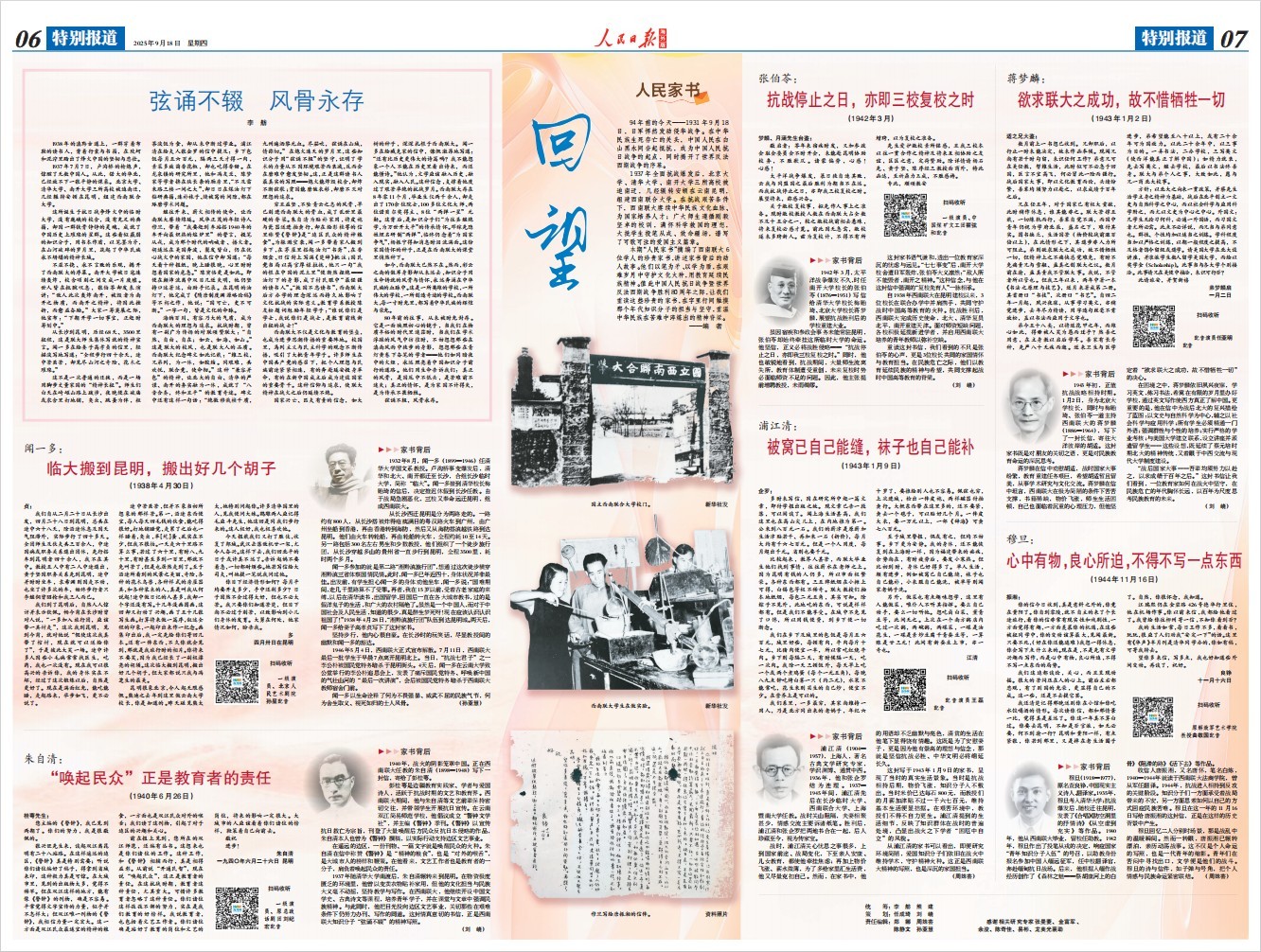 本期“人民家书”摘编了西南联大6位学人的珍贵家书,讲述家书背后的动人故事。他们以笔为矛、以学为盾,在艰难岁月中守护文化火种,用教育延续民族精神。值此中国人民抗日战争暨世界反法西斯战争胜利80周年之际,让我们重读这些珍贵的家书,在字里行间触摸那个年代知识分子的担当与坚守,重温中华民族在苦难中淬炼出的精神脊梁。