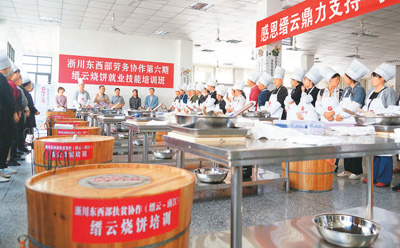 在第六期缙云烧饼培训班开班仪式上,67人参加培训,其中贫困户52人。目前,缙云县已协助南江县组织缙云烧饼培训6期135人次。钟继明摄