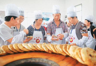 如今,赵一均师傅被称为“烧饼教头”。他边教边总结,把琢磨出来的经验写成《缙云烧饼师傅培训教材》,还成为《缙云烧饼制作规程》的主要制订者之一。粗略一算,赵一均带出的学徒已经超过1万人。伴随着学徒的一批批就业,烧饼的香味也从缙云飘向全国各地,有些学员还将烧饼店开到了美国、意大利、西班牙等国家,让缙云烧饼香飘海外。