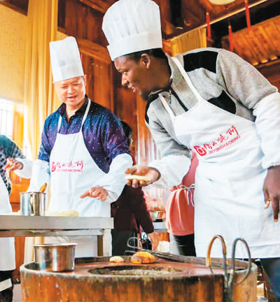 外国友人学做缙云烧饼。