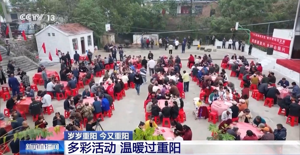 在河南鹤壁淇滨区谭峪村,乡亲们欢聚一堂,同吃团圆宴,共迎重阳节。当天,村里还有扇子舞、扭秧歌、拔河比赛等活动,为团圆宴助兴。